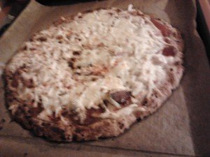 Ez meg itt az esti pizza. Túrós az alap, szénhidrát alig van benne. Zsír (vaj) annál több. 🙁 Kicsit megkapta a szélét a sütő, de olyan jól elbeszélgettünk. 😉